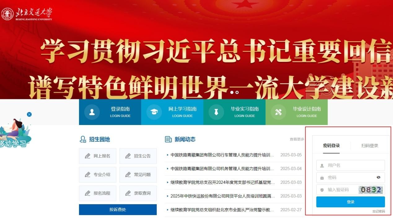 1.学习及考试地址:http://jxjy.bjtu.edu.cn/ 。账号为准考证号,登录密码为身份证号后六位。登录界面如下: